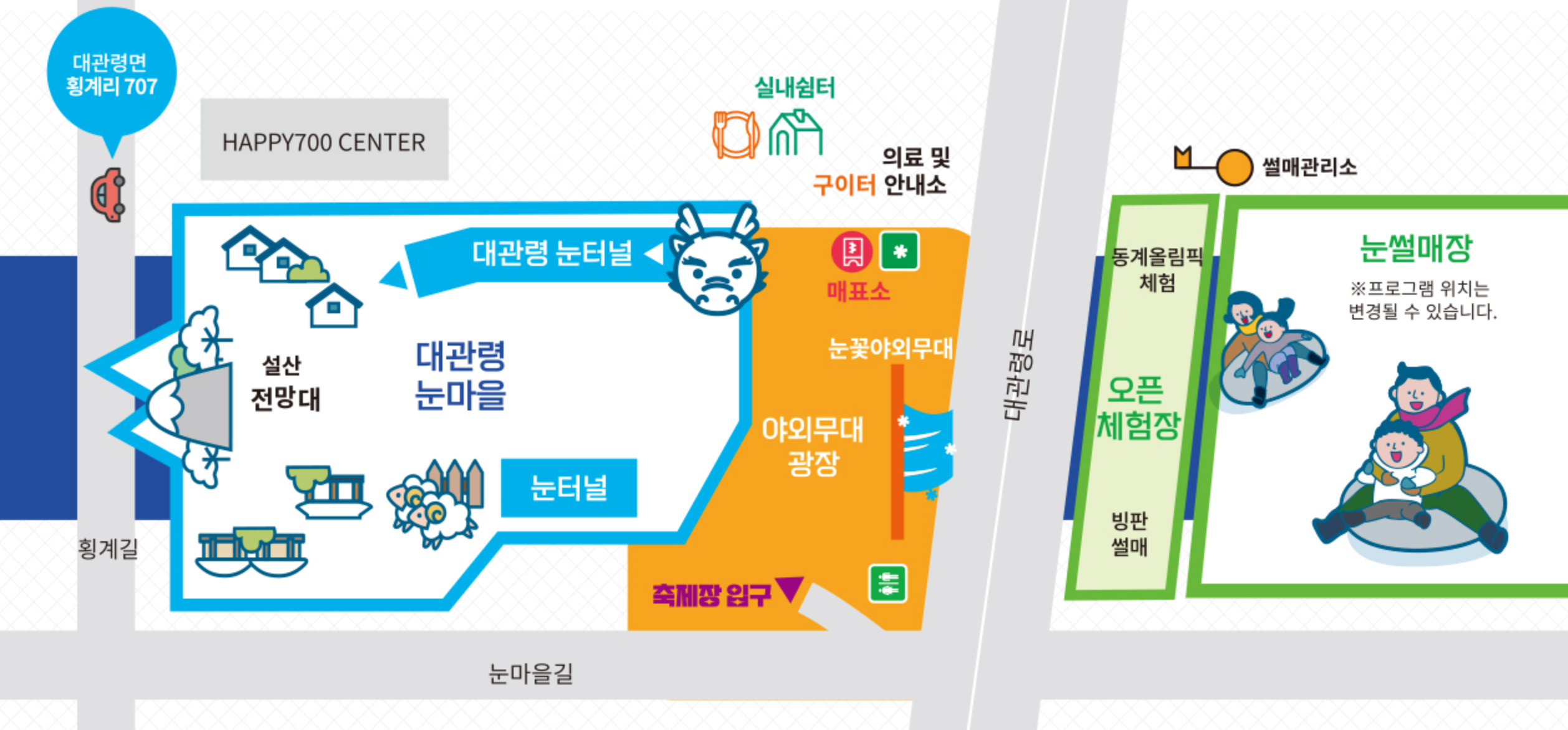 • 대관령눈꽃축제 제1주차장 : 대관령면 횡계리 707(올림픽메달프라자)