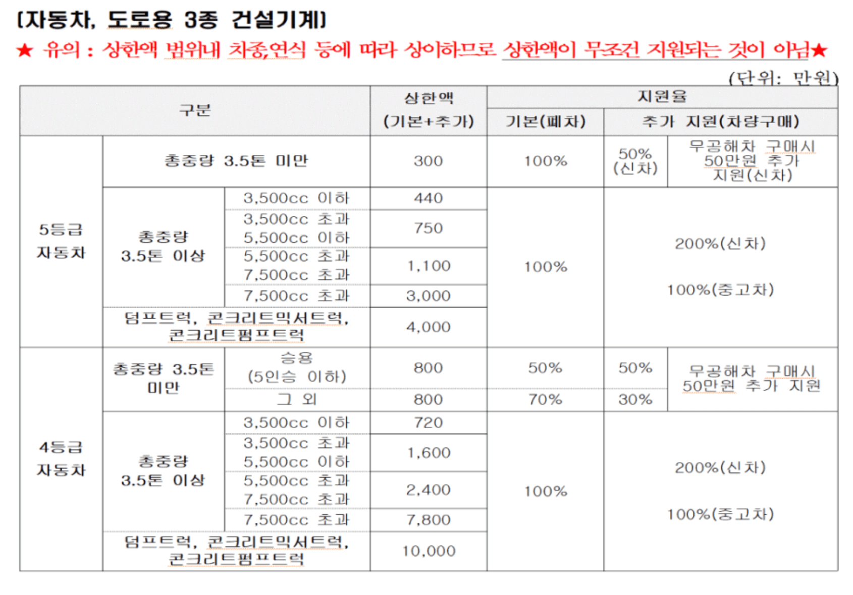 1) 5등급 중 3.5톤 미만인 승용 5인승일 때 기본 보조금이 폐차 후에 100%를 지급받고 추가 지원을 신청하면 차량구매 후 50%를 받고 무공해차량 구입 시 50만 원을 더 지원받습니다