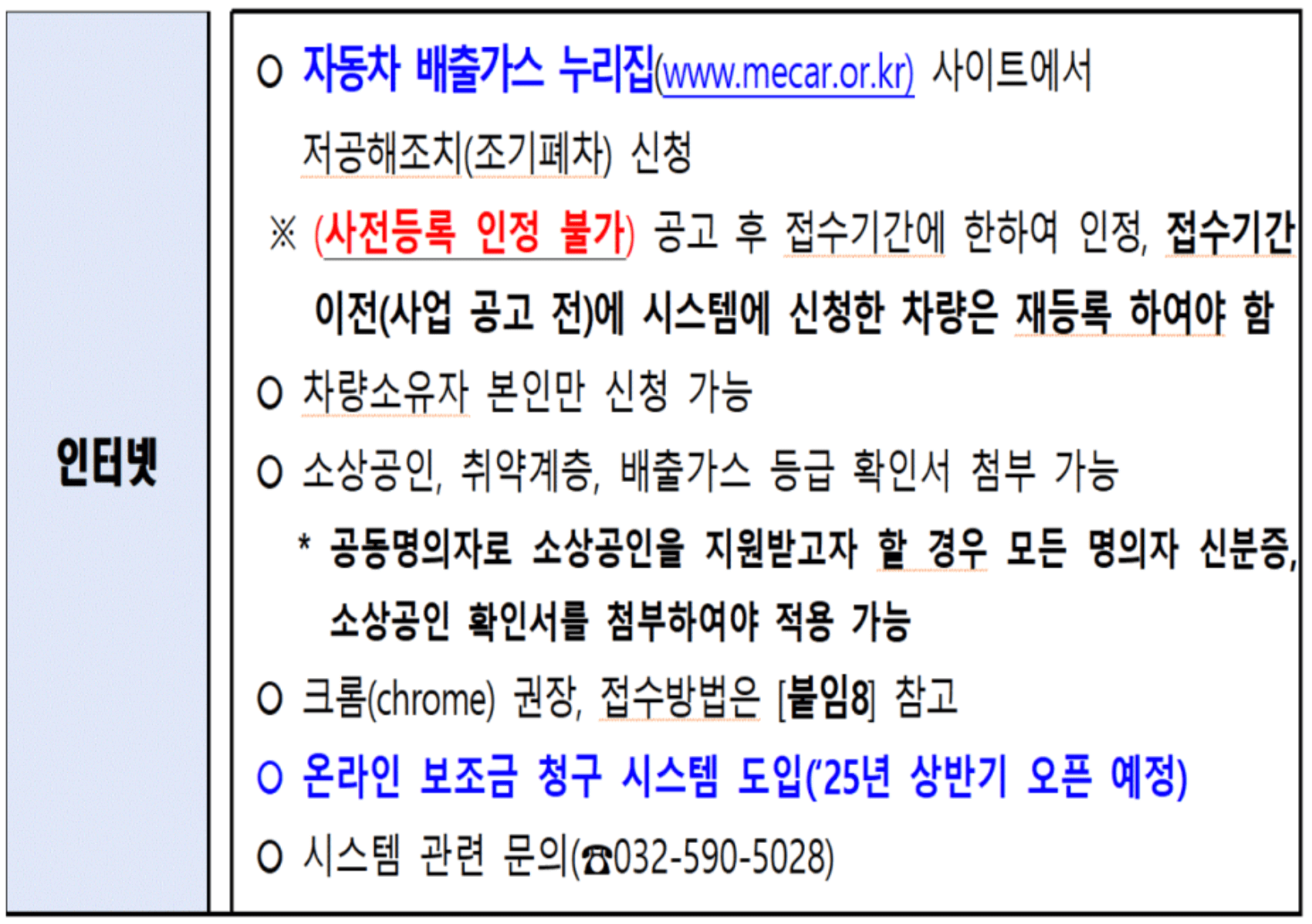 조기폐차 신청은 온라인 또는 우편 접수로 진행됩니다.