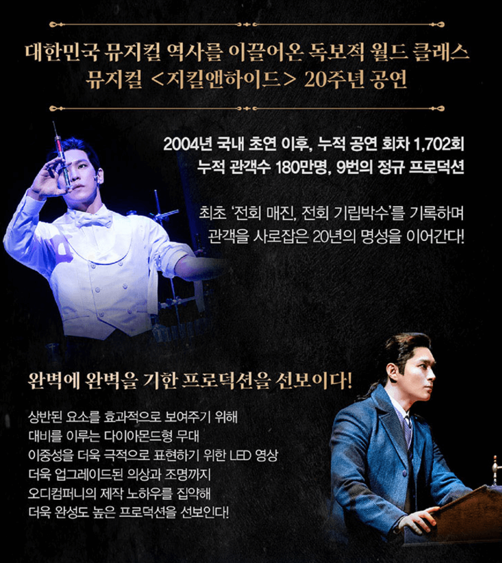 지킬과 하이드가 동일 인물이라는 사실은 이미 유명합니다. 인간의 선과 악을 탐구하는 깊이 있는 스토리와 감동적인 넘버(뮤지컬 곡)들이 많은 관객들을 매료시키고 있습니다.