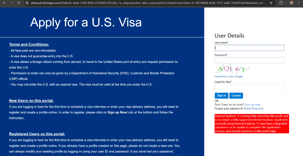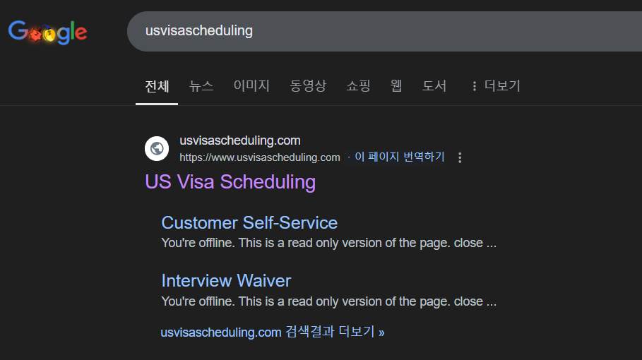 수수료를 납부한 후 하루정도 지난 후 구글(Google)검색창에 usvisascheduling을 복사해서 붙이시면 아래 이미지 화면을 볼 수 있습니다.