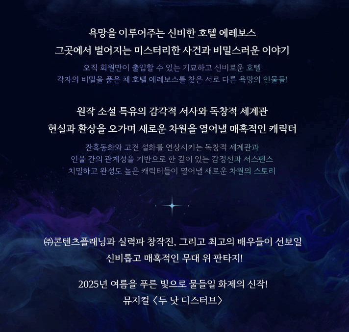 2025년 여름, 웹소설 원작의 감성 미스터리 뮤지컬 <두 낫 디스터브>가 관객들을 에레보스 호텔의 신비로운 세계로 초대합니다. 각기린 작가의 인기 웹소설을 원작으로 한 이 작품은 "꿈을 판매하는 호텔"이라는 독창적인 설정과 심리적 긴장감이 돋보이는 스토리로 이미 화제를 모으고 있습니다. 110분 동안 인터미션 없이 이어지는 강렬한 공연은 관객들에게 잊지 못할 체험을 선사할 예정입니다.