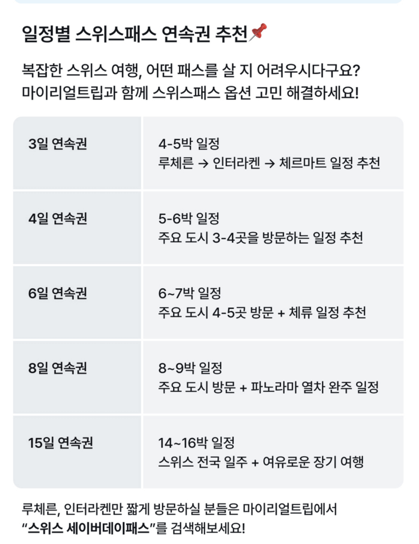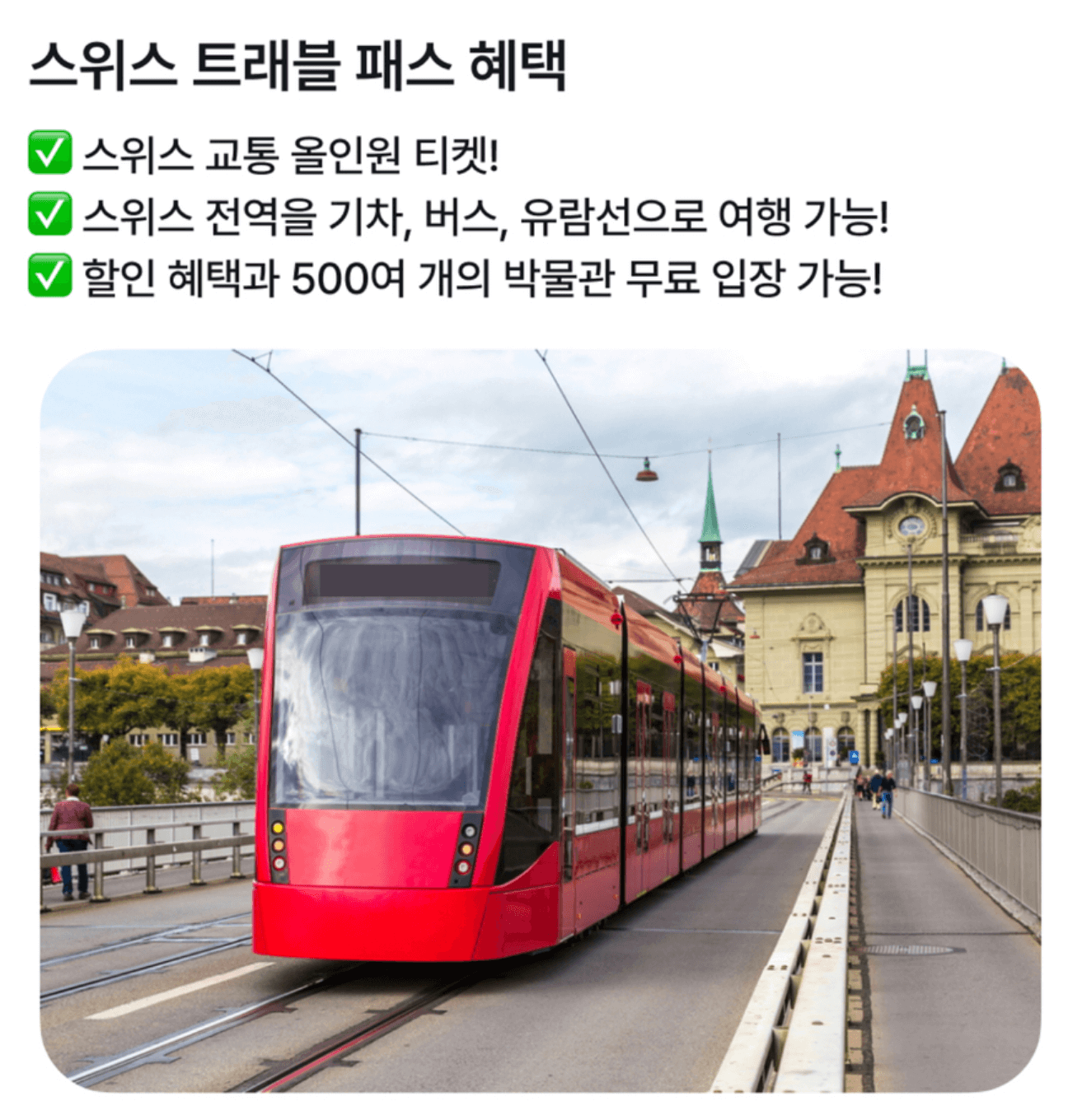 스위스 패스는 단순한 교통 티켓이 아니라스위스 여행의 모든 것을 여는 열쇠입니다. 잘 계획된 패스 사용으로 값비싼 스위스 여행을 합리적으로 즐기시길 바랍니다. 현지에서의 불필요한 티켓 구매 스트레스 없이, 아름다운 스위스 풍경에만 집중할 수 있는 최고의 선택이 될 것입니다.
