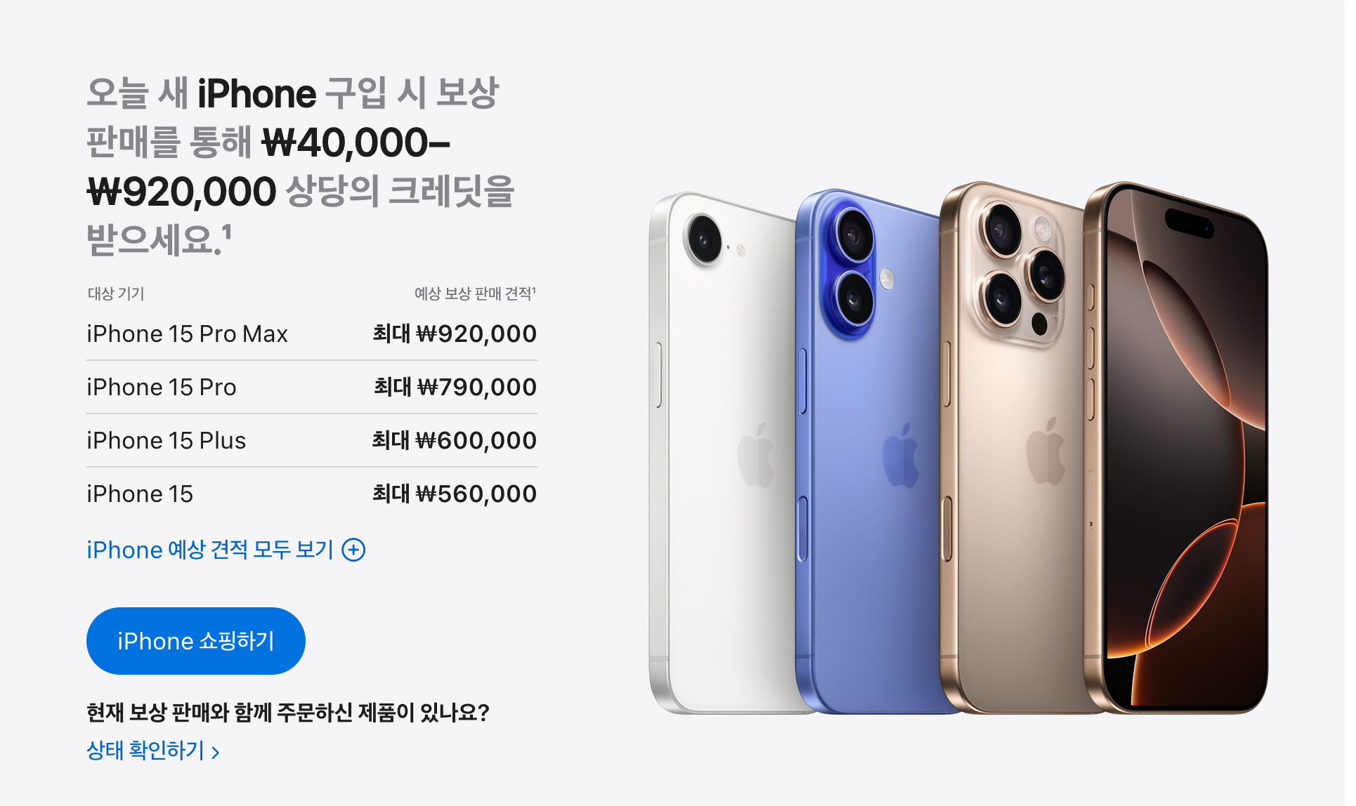 iPhone SE(2세대) 이후 모델을 보상 판매하고 iPhone 16e 를 ₩40,000 - ₩920,000 더 저렴하게. 무이자 할부도 가능. 지금 구입하고 무료 배송 혜택을 받아보세요.
