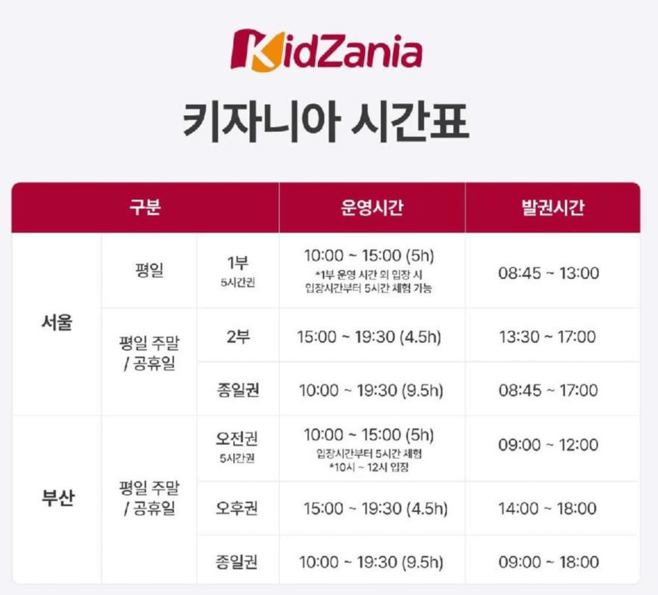 키자니아 서울의 운영 시간은 다음과 같이 구분됩니다: