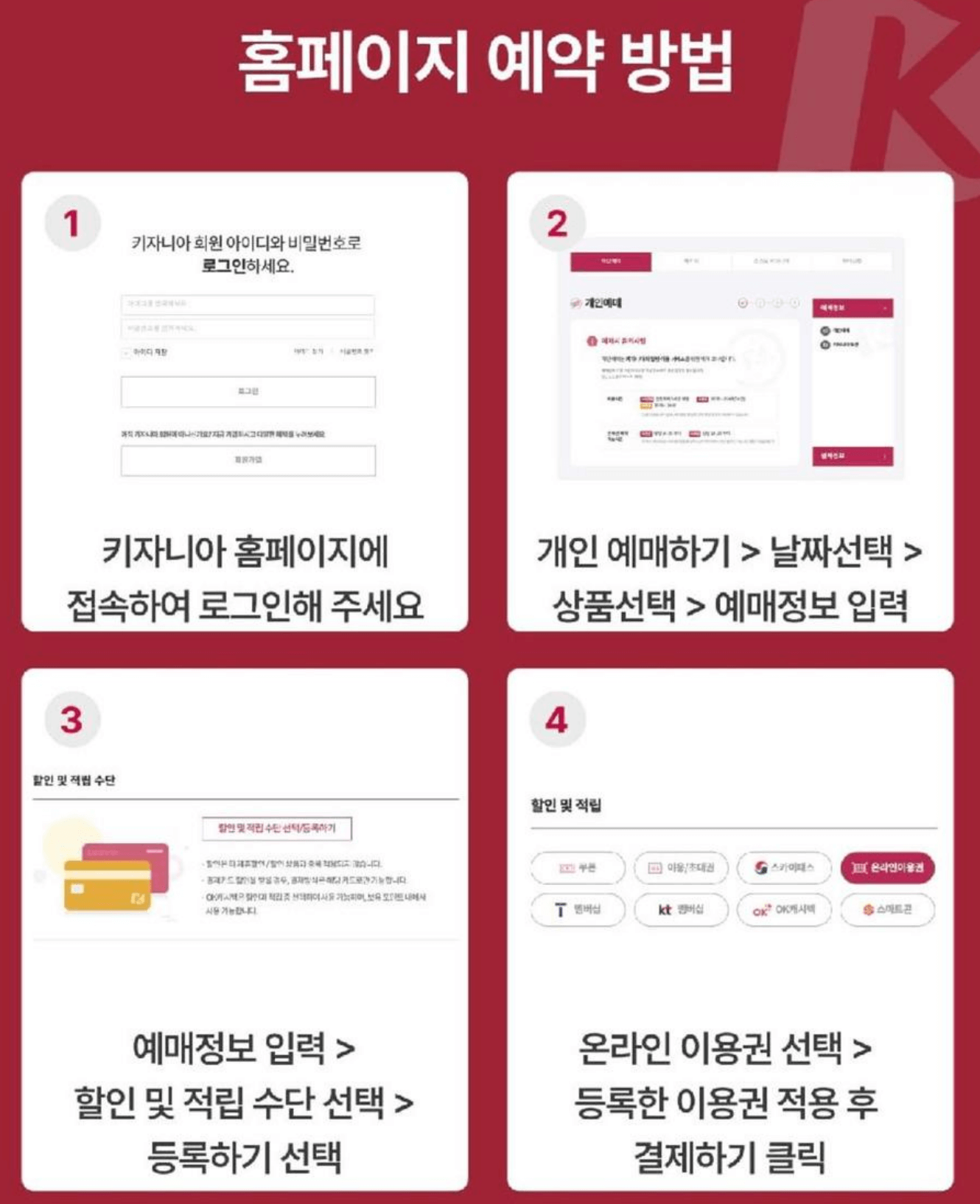 할인 티켓을 구매했다면 반드시 키자니아 공식 홈페이지나 모바일 앱에서 사전 예약을 완료해야 합니다. 예약은 '개인 예매 → 날짜 선택 → 상품 선택 → 예매정보 입력 → 할인 및 적립수단 적용' 순서로 진행하면 됩니다. 온라인으로 구매한 이용권은 카카오톡으로 전송되며, 현장에서 바로 입장할 수 있습니다.