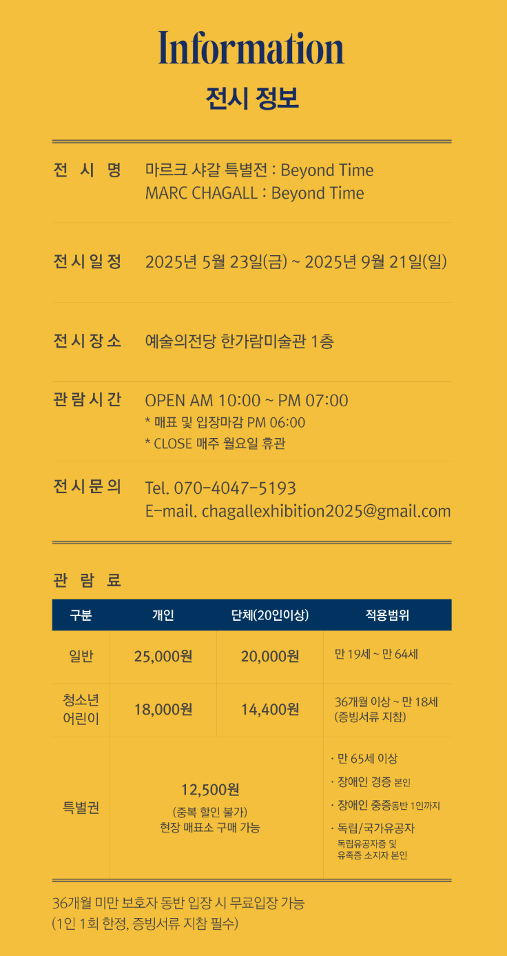 마르크 샤갈 특별전 : BEYOND TIME은 연령 불문, 성별 무관, 누구에게나 감동을 선사하는 전시입니다. 아이에게는 꿈과 상상력을, 어른에게는 잊고 있던 감정과 기억을 떠올리게 하는 샤갈의 마법이 여러분을 기다립니다.