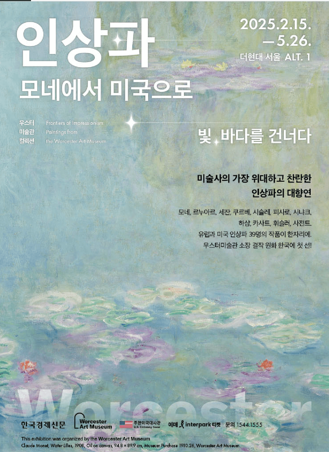 "인상파: 모네에서 미국으로"는2025년 2월 15일부터 5월 26일까지더현대 서울 6층ALT.1에서 열리는 대규모 인상파 특별전입니다.미국 우스터 미술관(Worcester Art Museum)의 소장품을 중심으로유럽과 미국 인상파의 걸작 39점이 한국에서 처음 공개됩니다.