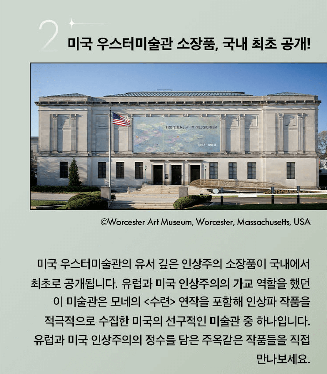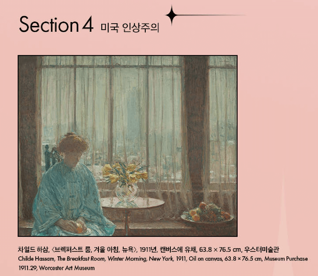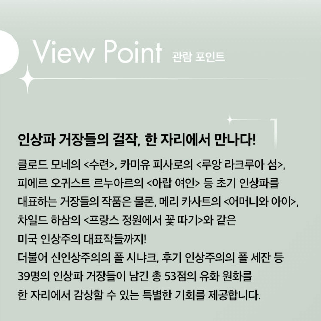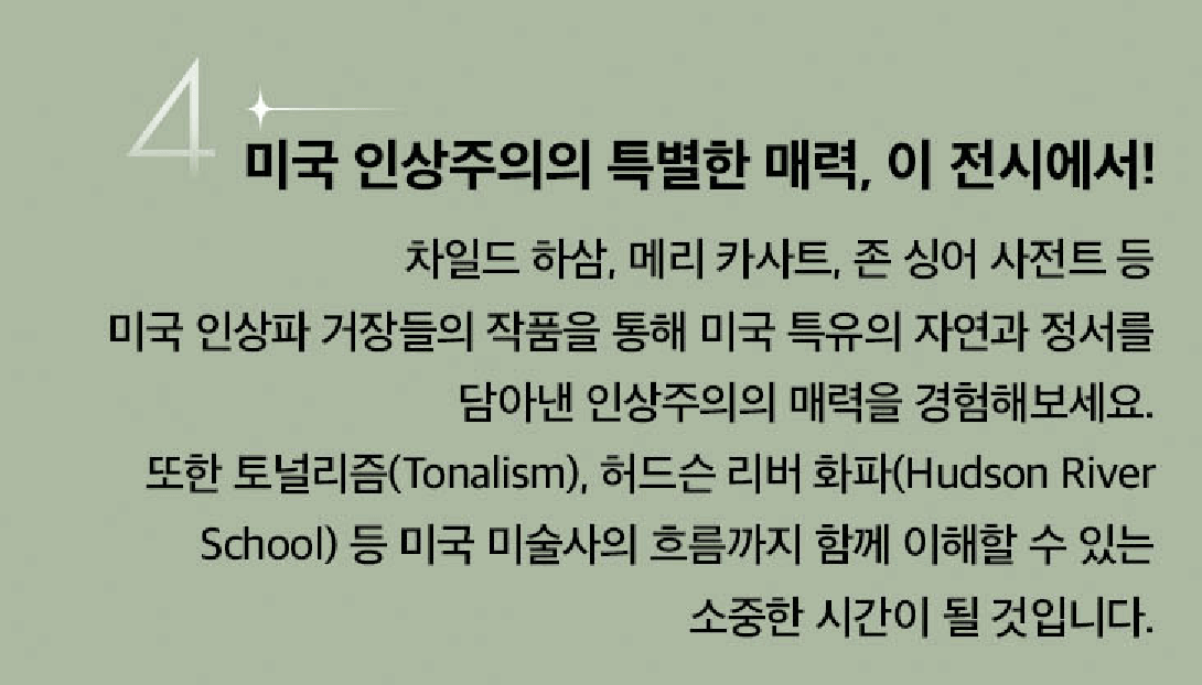이번 전시는"인상주의가 어떻게 유럽에서 미국으로 확산되었는지"를 주제로,모네, 르누아르, 세잔, 쿠르베, 시슬레, 피사로등 유럽 인상파 거장들과 함께메리 카사트(Mary Cassatt), 존 싱어 사전트(John Singer Sargent), 제임스 휘슬러(James Whistler)등 미국 인상파 작가들의 작품을 비교하며 감상할 수 있습니다.