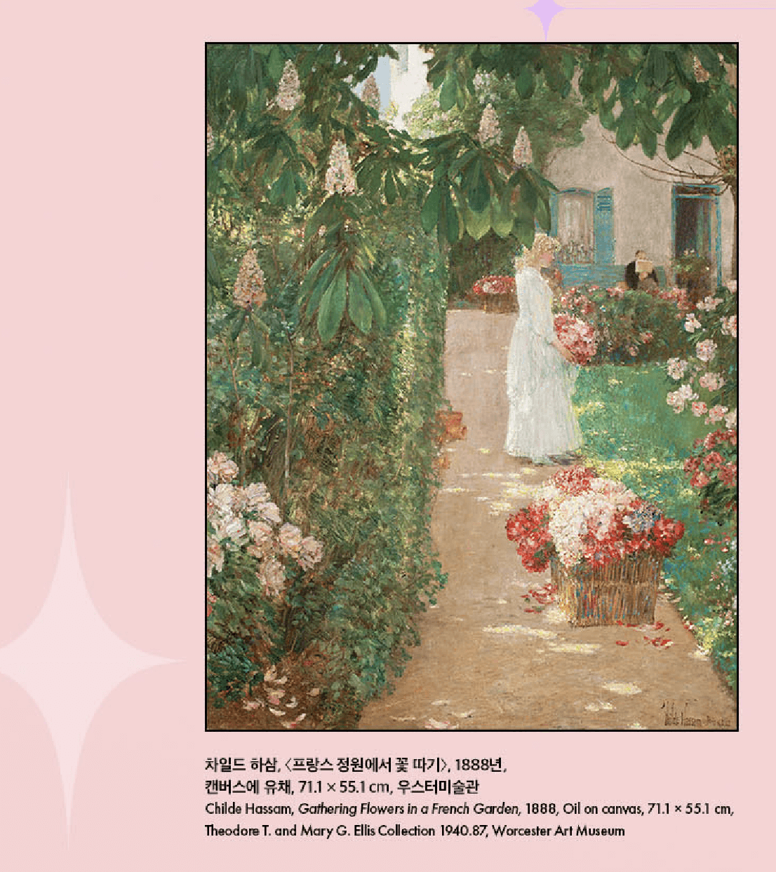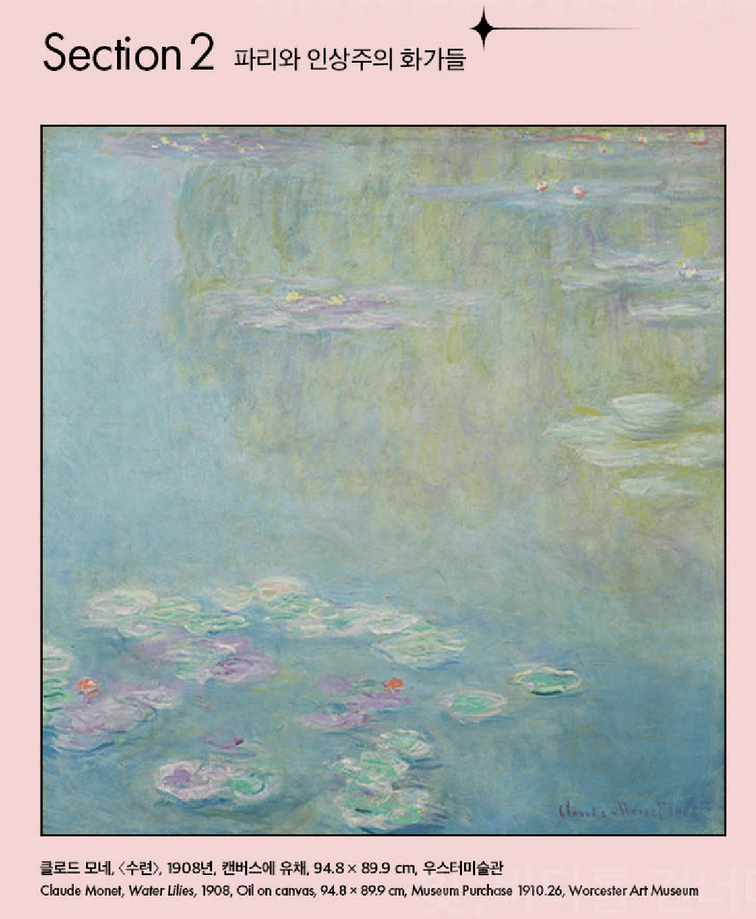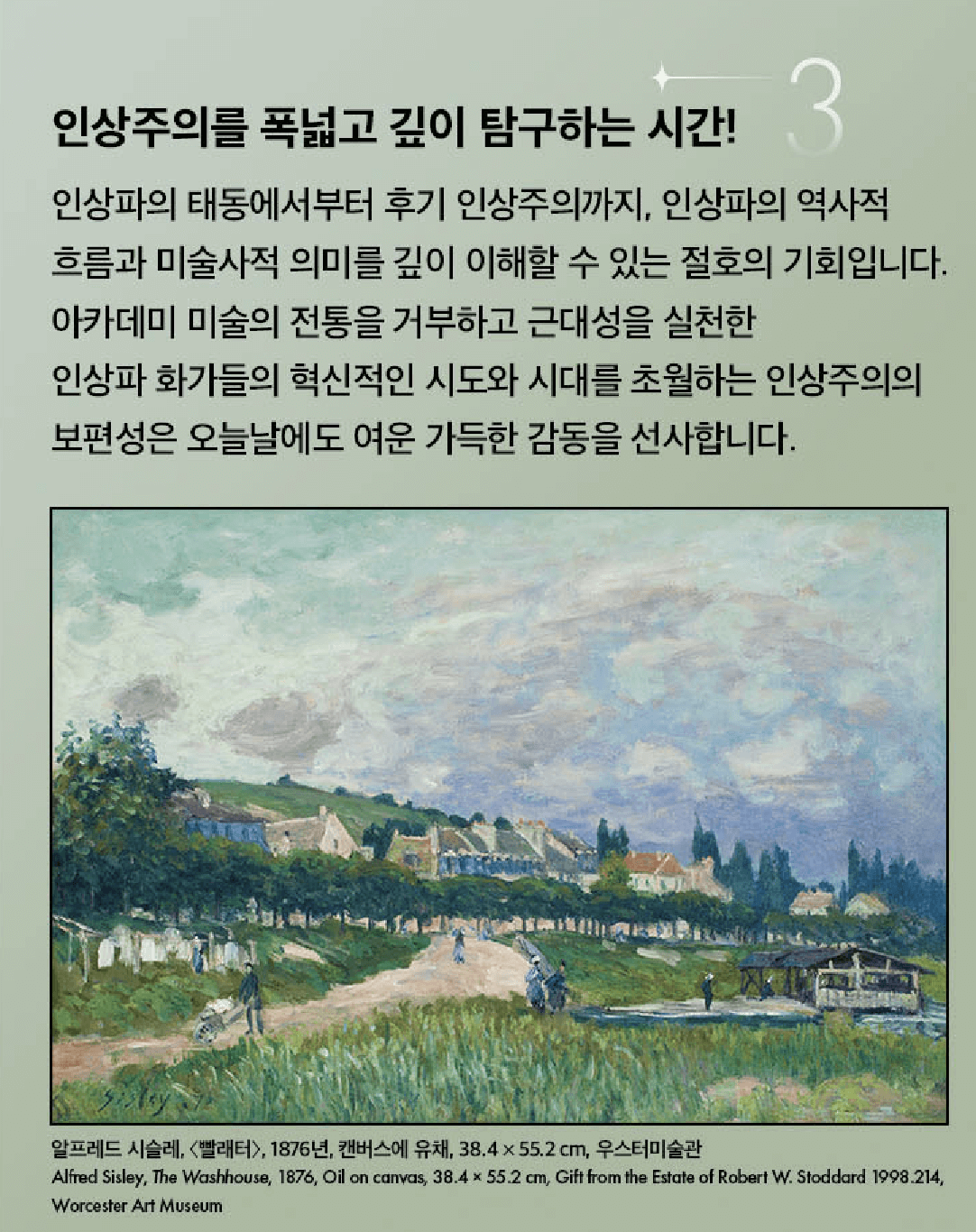 이번 전시는"인상주의가 어떻게 유럽에서 미국으로 확산되었는지"를 주제로,모네, 르누아르, 세잔, 쿠르베, 시슬레, 피사로등 유럽 인상파 거장들과 함께메리 카사트(Mary Cassatt), 존 싱어 사전트(John Singer Sargent), 제임스 휘슬러(James Whistler)등 미국 인상파 작가들의 작품을 비교하며 감상할 수 있습니다.