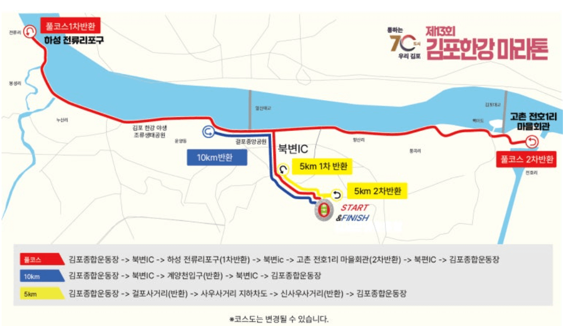- 10km: 김포종합운동장 - 북변IC - 계양천입구 (반환) - 북변IC - 김포종합운동장