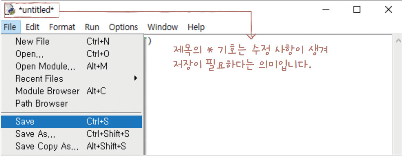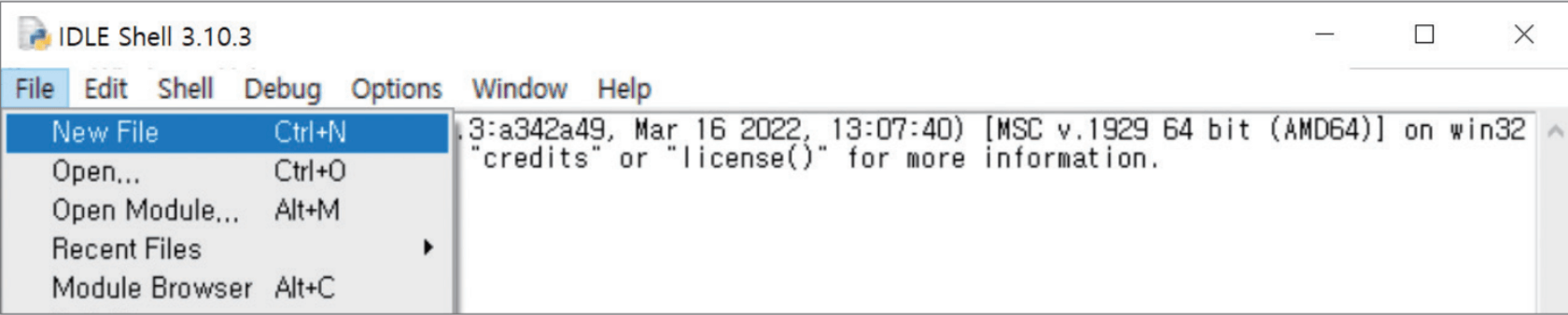 02 Python IDLE은 기본적으로 인터렉티브 셸처럼 파이썬 코드를 입력하고 실행 결과를 곧바로 확인할 수 있습니다. 프롬프트에서 명령을 입력하는 방법은 바로 앞에서 설명한 파이썬 인터렉티브 셸과 동일하므로 여기서는 긴 코드를 입력할 때 파일을 만들어 실행하는 방법을 설명하겠습니다 [File] - [ New File ] 메뉴 선택