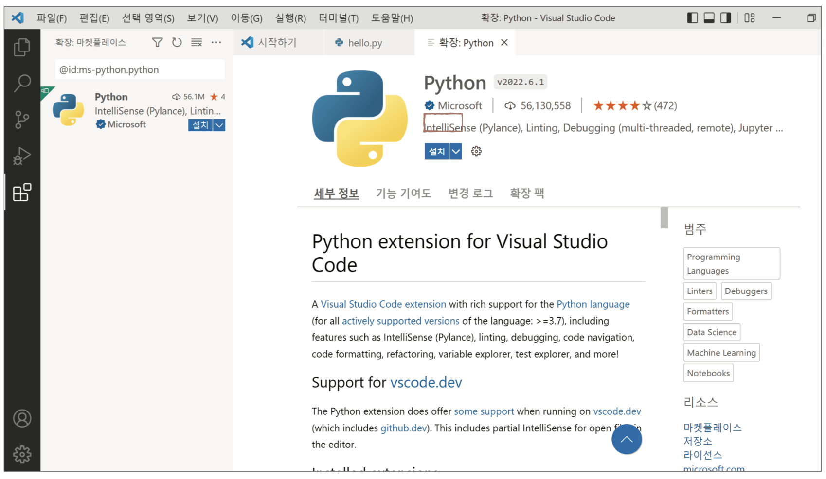 * python 확장 기능 설치를 권장하는 메뉴가 나타나지 않아요!