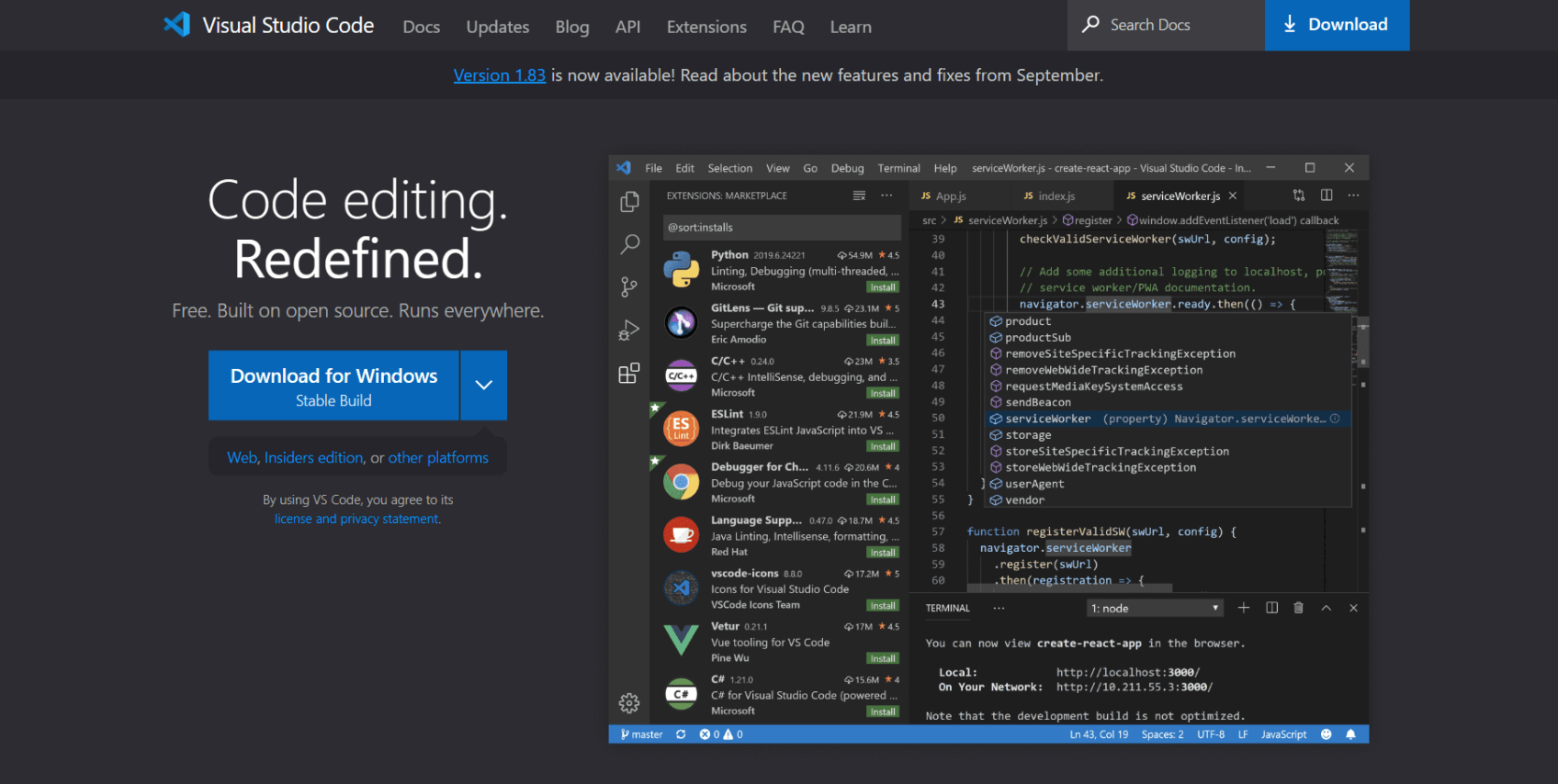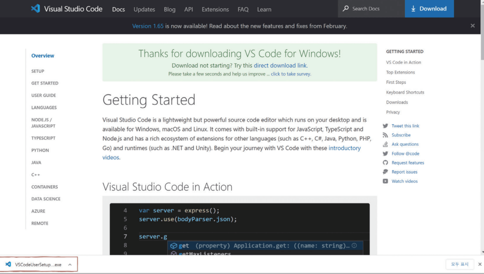 01 일단 비주얼 스튜디오 코드의 설치 프로그램을 다운로드해야 합니다. 비주얼 스튜디오 코드 홈페이지에 접속해서 [Download for windows]를 클릭하여 설치파일을 다운로드합니다.