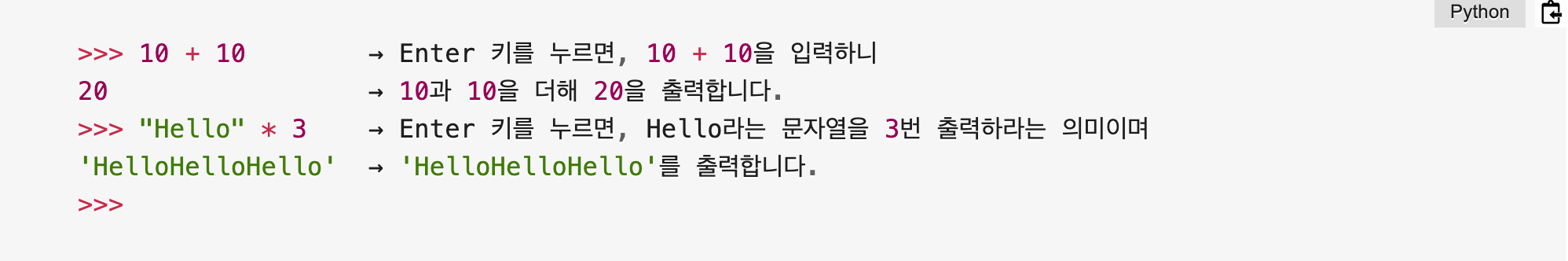다음과 같이 프롬프트(prompt)라 불리는>>>에 코드를 한줄한줄 입력하면 곧바로 실행결과를 볼수 있습니다 컴퓨터와 상호작용하는 공간이라는 의미로 인터렉티브 셸이라고 부르며 한 마디씩 주고받는 것처럼 대화한다고 해서 대화형 셸이라고 부르기도 합니다.