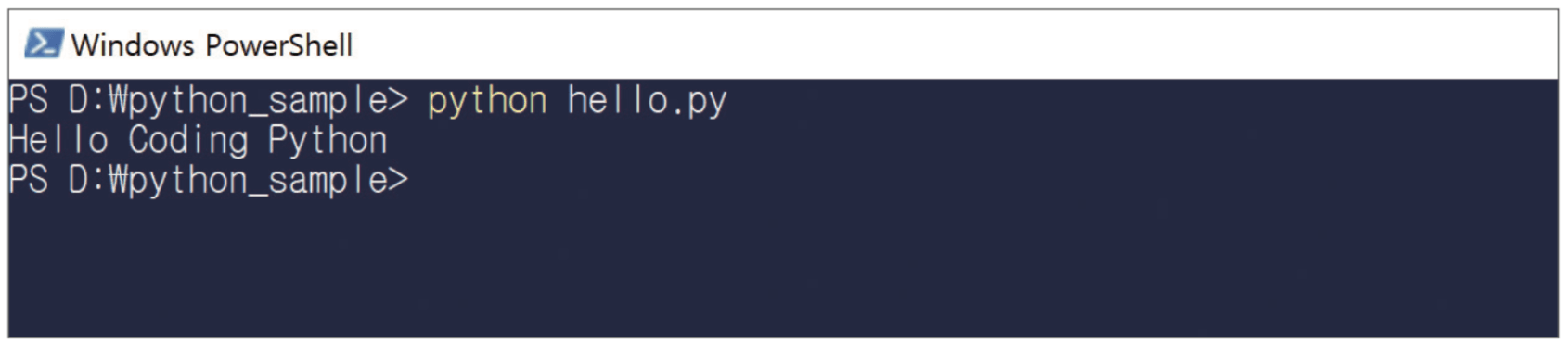 08 해당 폴더에서 윈도우 파워셸 또는 명령 프롬프트가 실행됩니다. 윈도우 파워셸이나 명령 프롬프트에서 파이썬 프로그램을 실행할 때는 python 명령어를 사용합니다. 그러므로 [python hello.py]만 입력하고 Enter 키를 누릅니다.