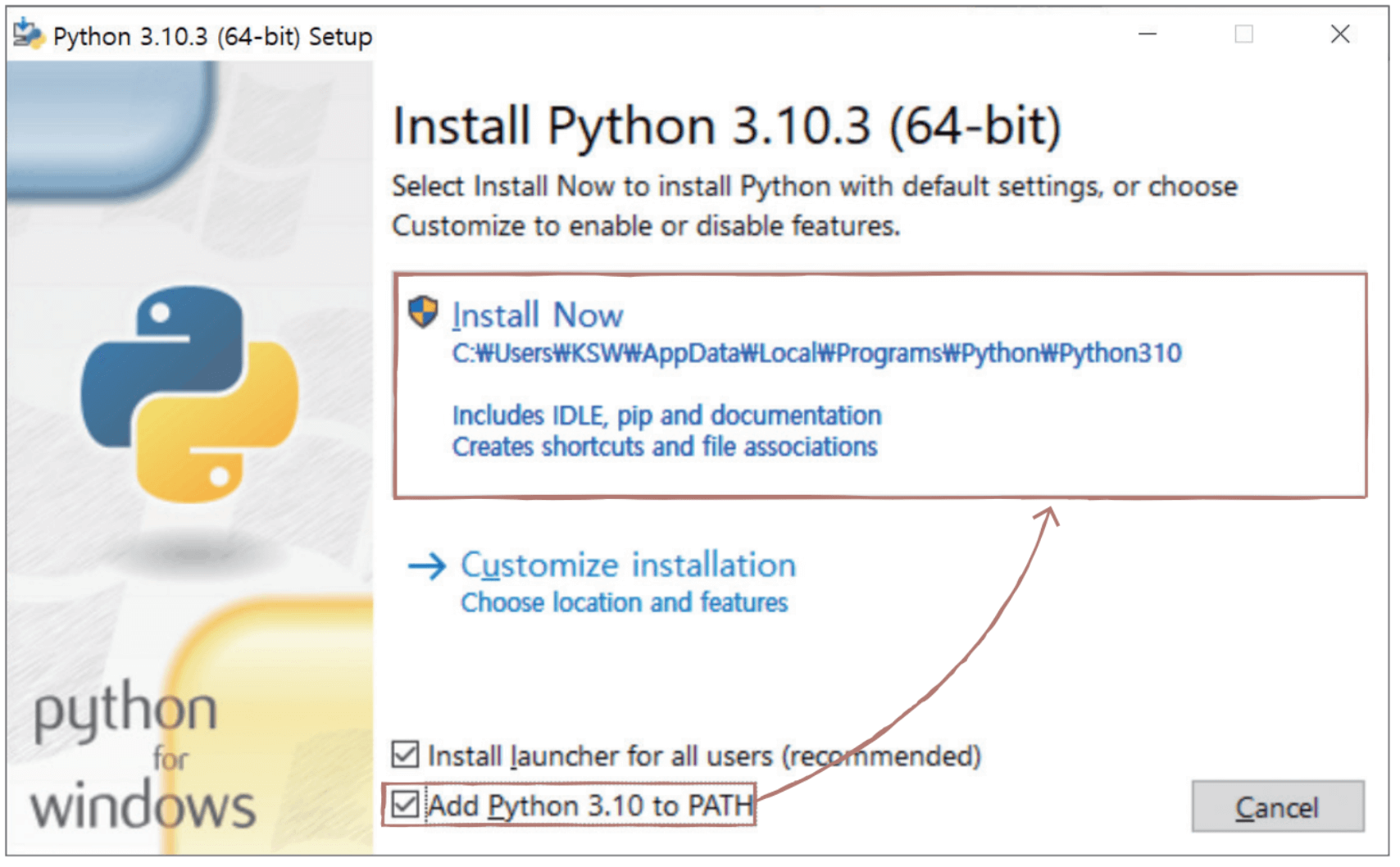 ** [Add Python 3.10 to PATH]는 프로그램의 실행 경로(PATH)에 파이썬을 추가한다는 의미입니다. 체크 후 설치해야 이후에 명령 프롬프트에서 [python]이라고 입력해서 파이썬을 실행할 수 있습니다. 만약 체크하지 않고 설치하면 다시 설치해야 합니다.