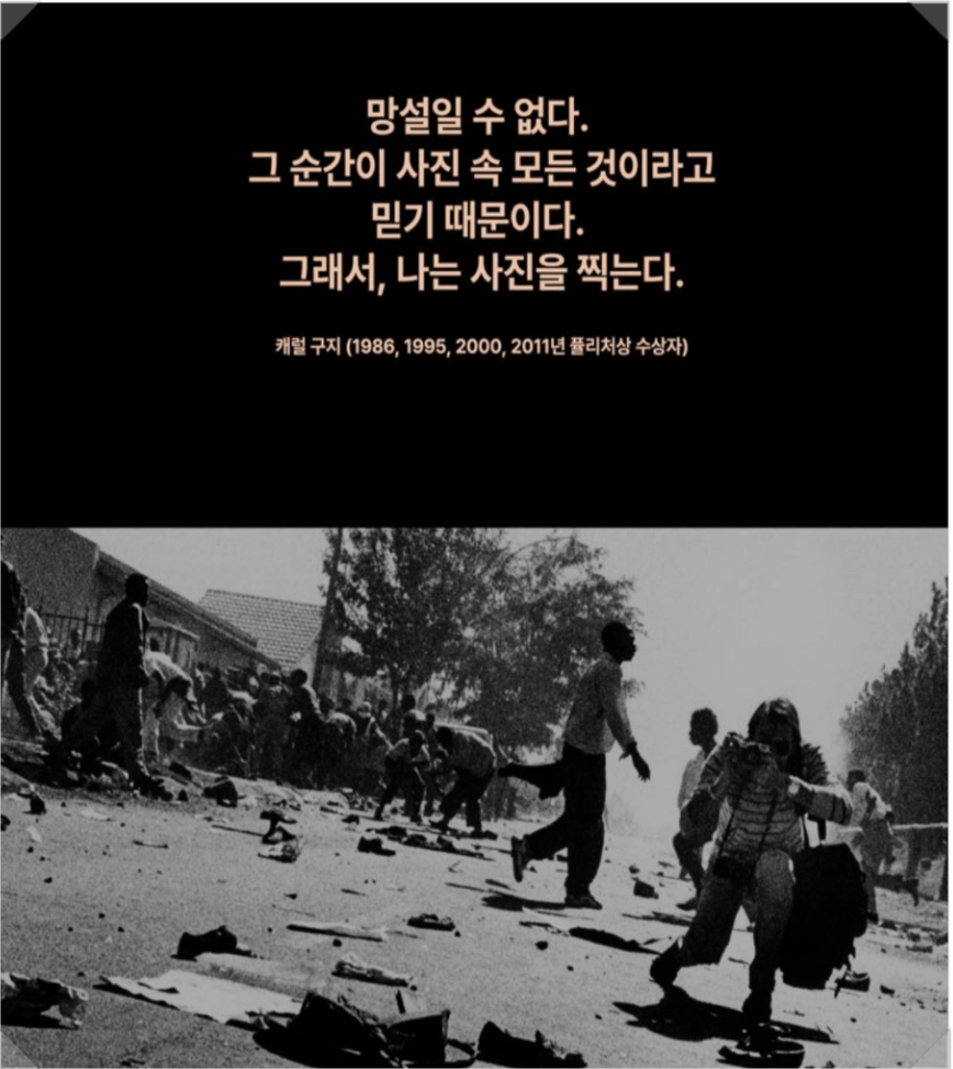 "망설일 수 없다. 그 순간이 사진 속 모든 것이라고 믿기 때문이다. 그래서 나는 사진을 찍는다." - 캐럴 구지(퓰리처상 4회 수상자)