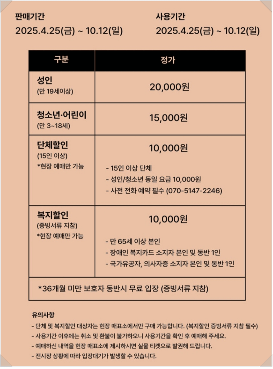 15인 이상 단체 관람 시 사전 예약 필수 (070-5147-2246)