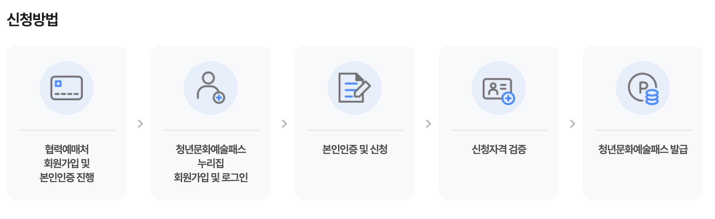 청년문화예술패스 신청은 다음과 같은 단계로 진행됩니다: