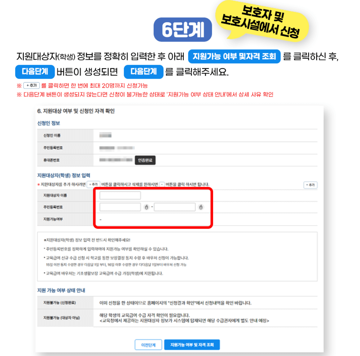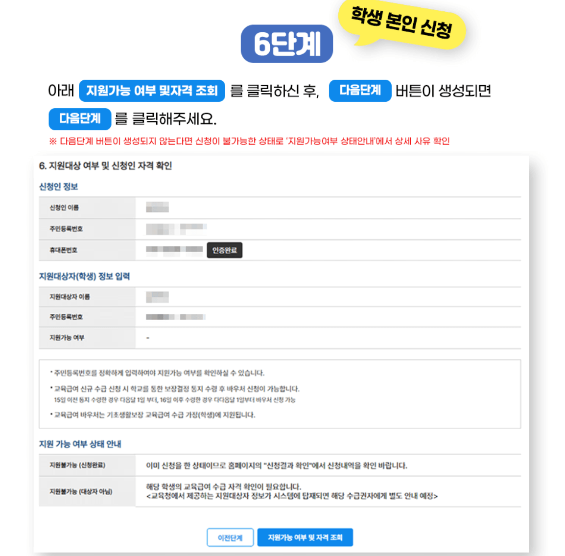 6. 아래 지원가능 여부 및 자격조회를 클릭한후 다음 단계 버튼이 생성되면 다음 단계를 클릭해 주세요.