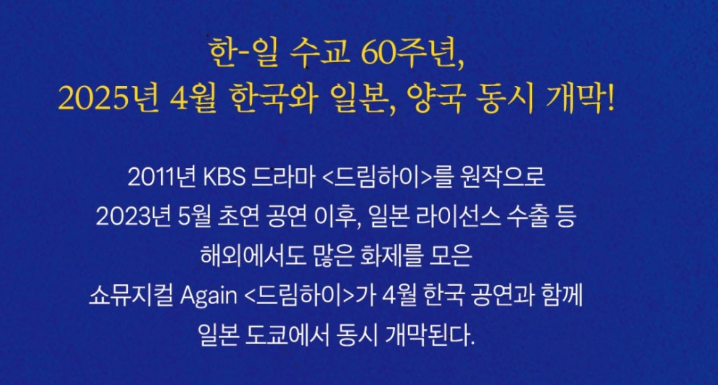 2025년 4월, 한일 수교 60주년을 기념하여 한국과 일본에서 동시에 개막하는 **쇼뮤지컬 Again "드림하이"**가 큰 화제를 모으고 있습니다. 2011년 KBS 인기 드라마 [드림하이]를 원작으로 한 이 작품은 2023년 초연 이후 일본에서도 폭발적인 인기를 끌며 글로벌 K-콘텐츠로서의 위상을 공고히 했습니다.