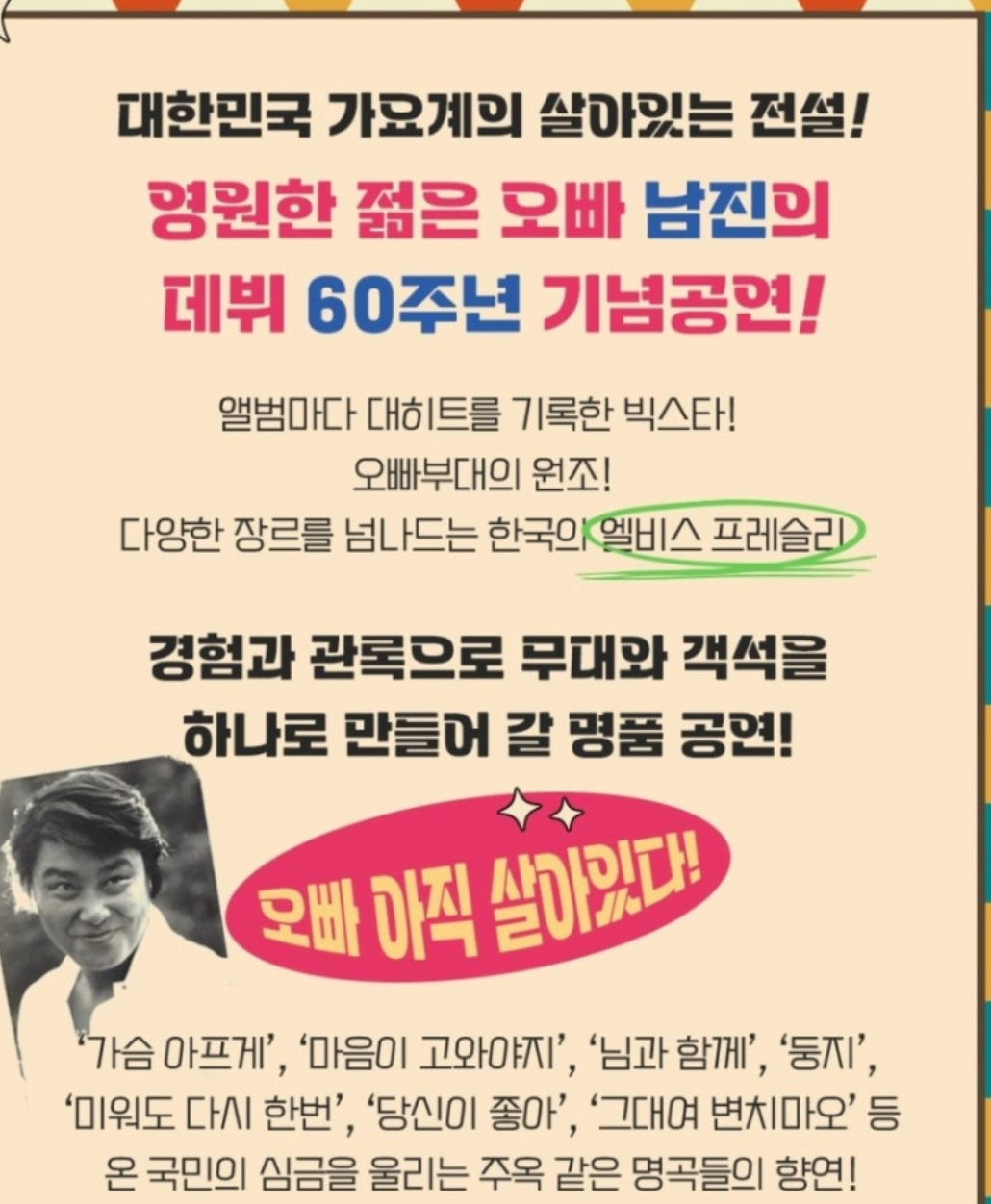 2025년은 남진이 1965년 〈나야 나〉로 데뷔한 지 정확히 60년이 되는 해입니다. 한국 대중음악사에서 단일 아티스트로 60년 동안 왕성한 활동을 이어온 경우는 매우 드뭅니다. 이번 투어는 단순한 콘서트가 아닌 한국 현대음악사의 한 획을 그은 아티스트의 음악 인생을 조명하는 자리입니다.