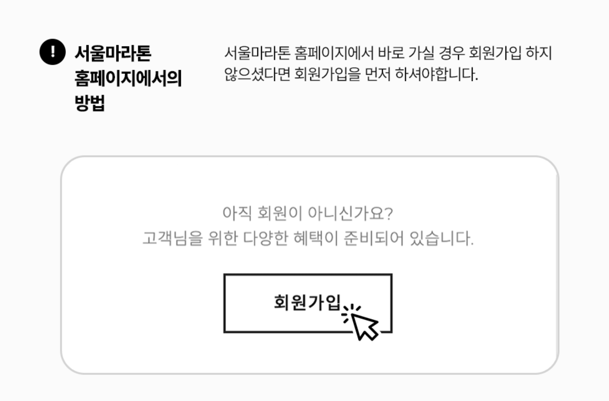회원가입 후 상단 메뉴에서 참가접수 클릭 - 서울 마라톤 패키지 선택